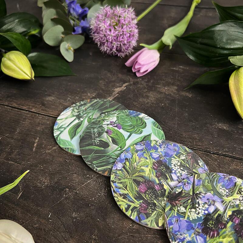 Wunderschöne Glasuntersetzer mit dem Blumenmotiv von Anne Just – eine elegante Hommage an die Farben und Formen der Blumen in deinem Zuhause. Perfekt, um deinen Tisch zu schützen, damit sich keine Ringe auf der Oberfläche bilden.