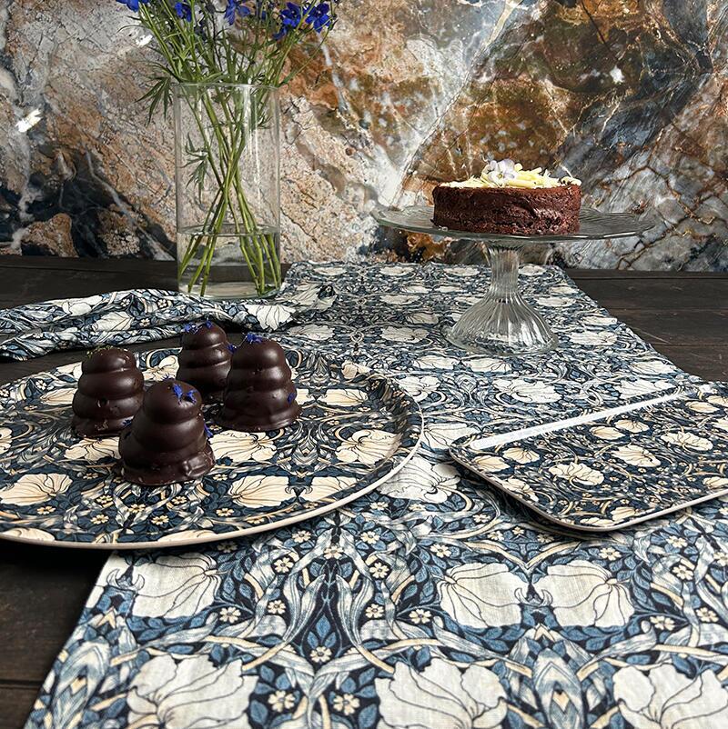 Round serving tray with the Pimpernel blue motif, an original design by the renowned artist William Morris, combines timeless aesthetics with natural beauty. The detailed, winding flowers and leaves in cool blue tones create an atmosphere of calm and refined style.