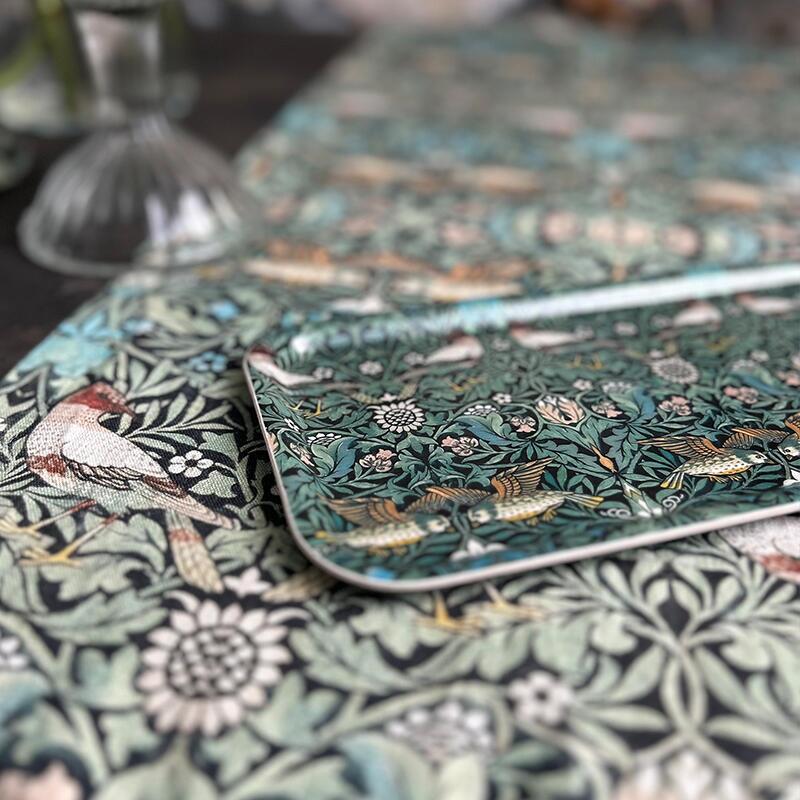 Aporta la calma y la belleza de la naturaleza a tu mesa con esta preciosa bandeja. El motivo Bird de William Morris, en tonos verdes, azules y marrones, resalta pájaros, hojas y flores para que tu puesta de mesa se sienta viva y armoniosa. La textura natural del lino combina funcionalidad con un aspecto clásico y cercano a la tierra – perfecta tanto para el día a día como para ocasiones especiales.