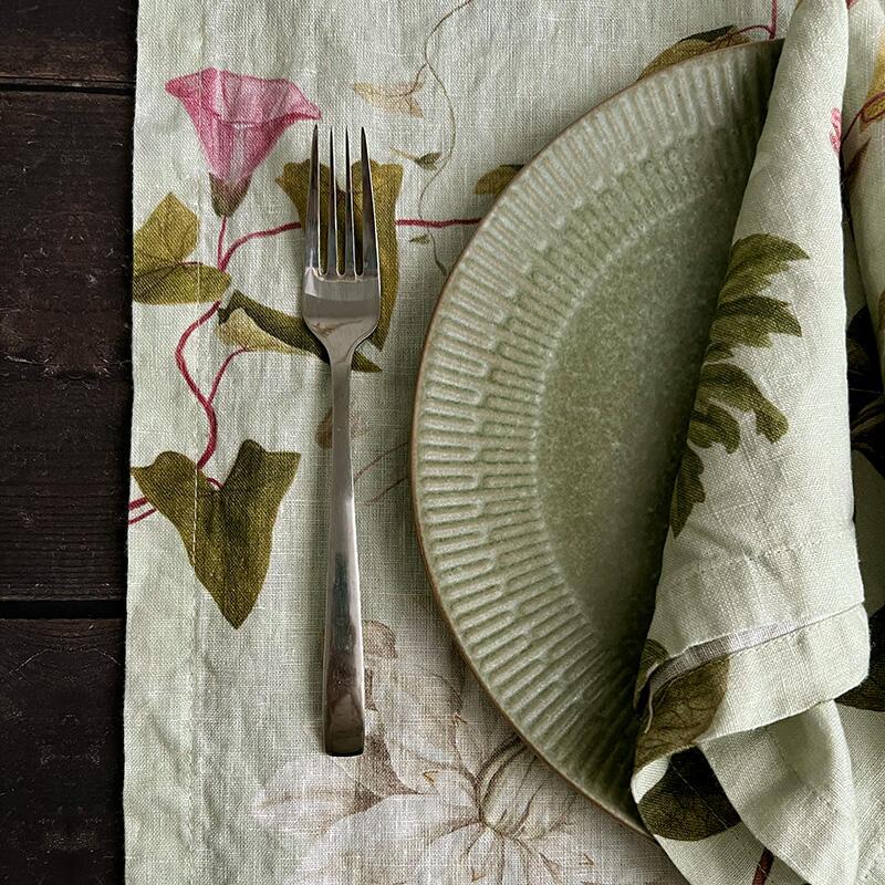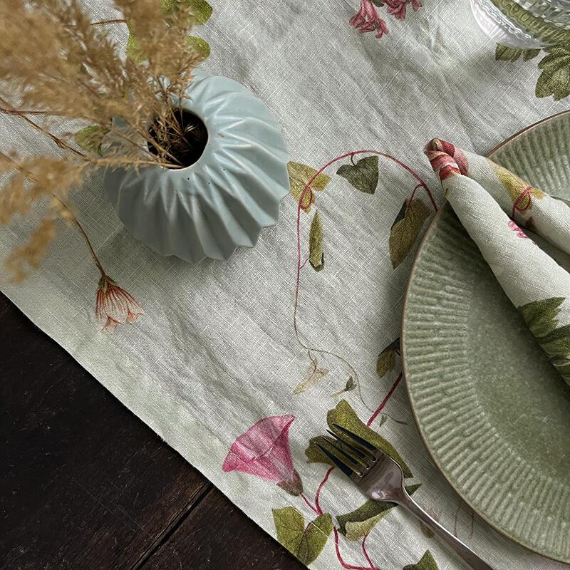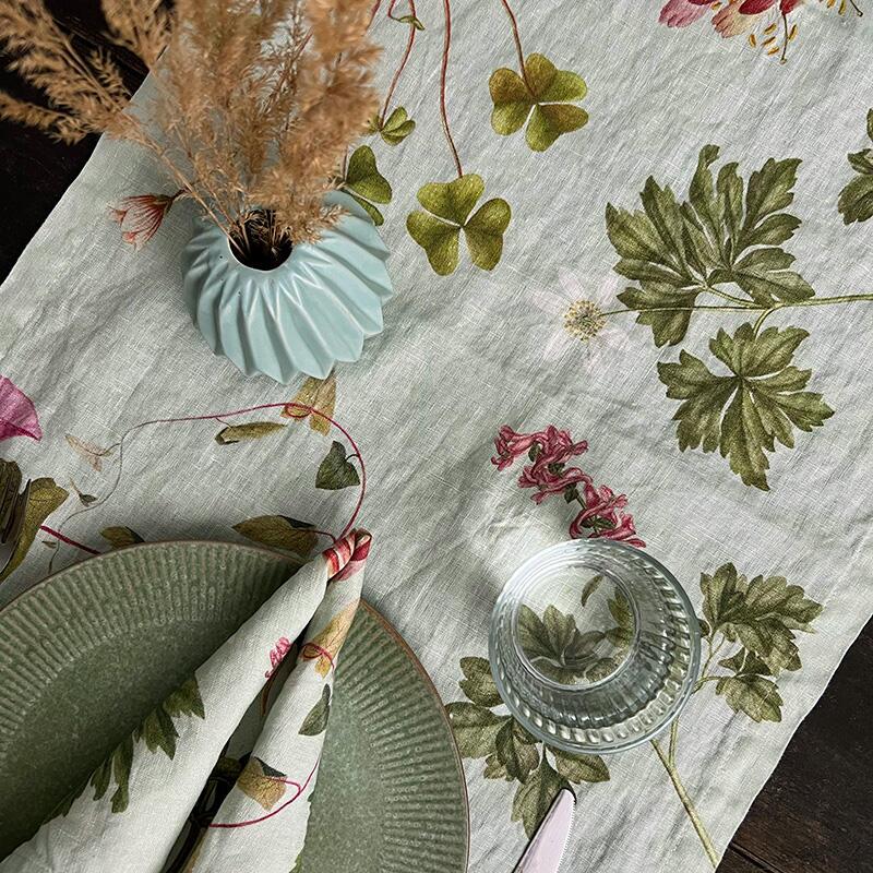 Camino de mesa suave y exclusivo en lino de cultivo natural con hermosos motivos de plantas silvestres del atlas botánico Flora Danica.