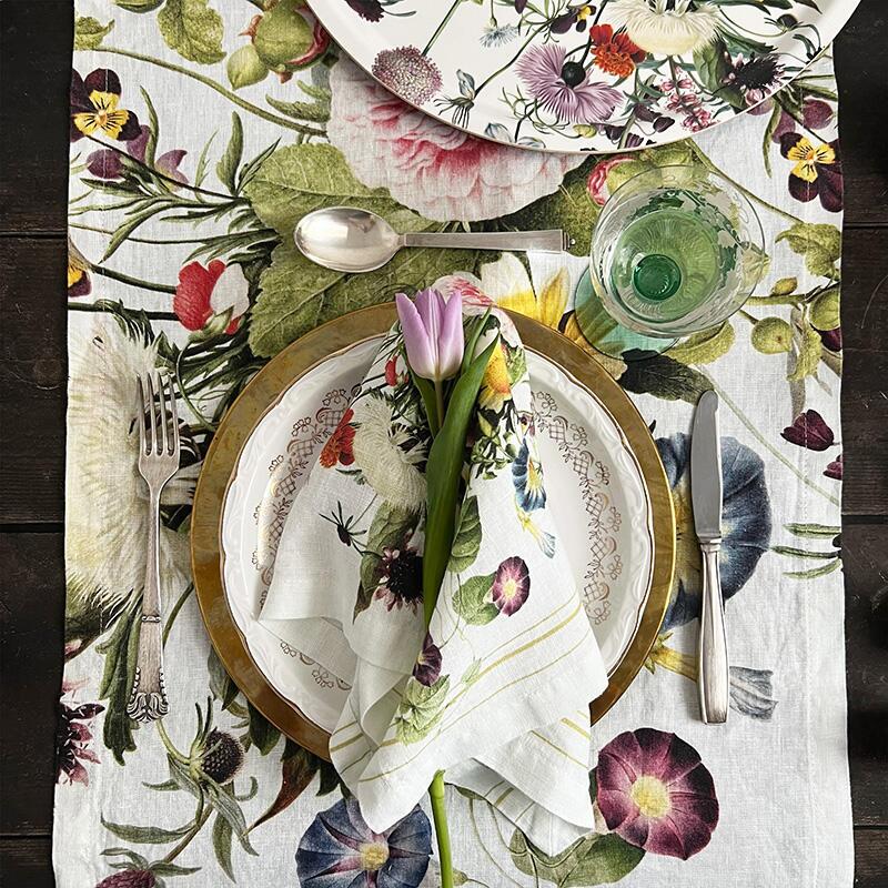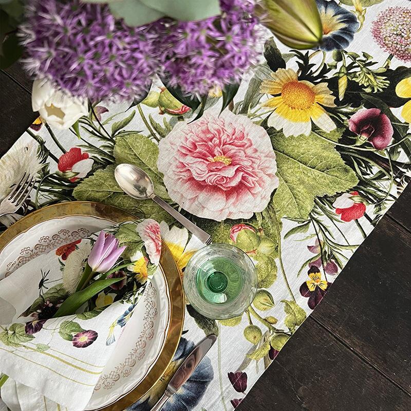 Ylellinen, pehmeä ja ihana Kaitaliina kivipestyä pellavaa, jossa on värikäs kukkiva puutarhakaava. Pöytäjuoksu on osa suositun Flower Garden-sarjan ainutlaatuista design-yhteistyötä: Jim Lyngvild ja Koustrup & Co.