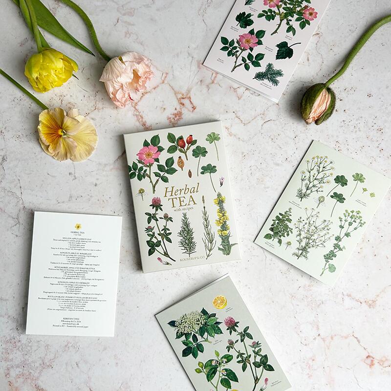 Kauniit laatukortit, joissa on 8 erilaista kasvimotiivia ja mukana resepti eri ihaniin yrttiteevalmisteisiin. Kuvittanut Kirsten Tind.