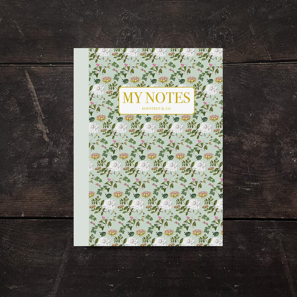 Kaunis muistiinpanovihko, jonka kannessa on villikasvien kukkakuvioita botaanisesta atlasista Flora Danica.