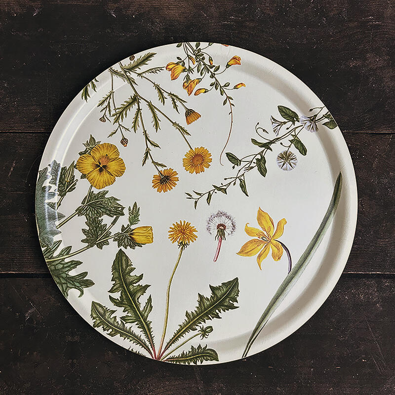 Smuk rund bakke med smukke blomster i varme gule nuancer inspireret af det ikoniske botaniske værk Flora Danica – ideel til servering af drikkevarer og snacks, som smuk borddekoration eller til at organisere småting med stil.